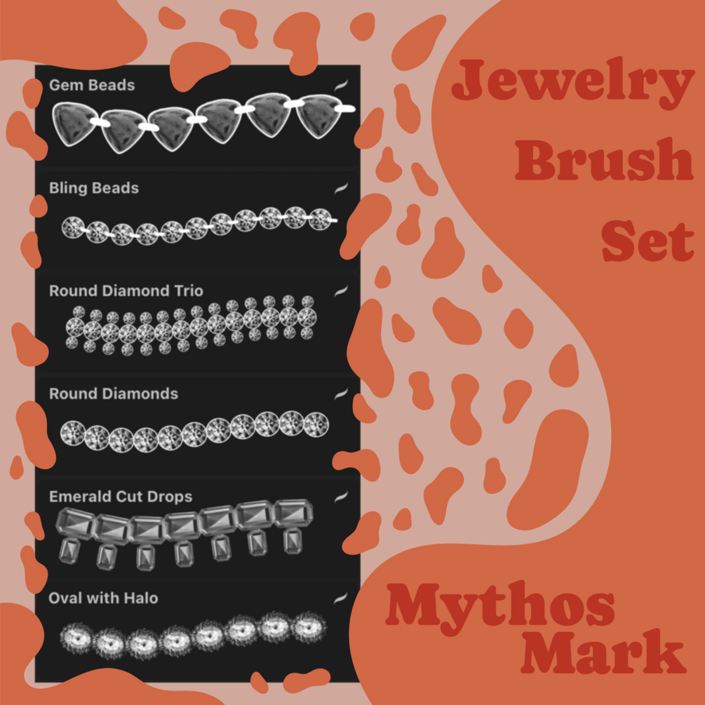 The Jewerly Brush Set includes 6 dazzling brushes you can use to add some sparkle to your artwork! Easily add a necklace, bracelets, earrings, and more to your digital art with ease with this new brush set by Mythos Mark!