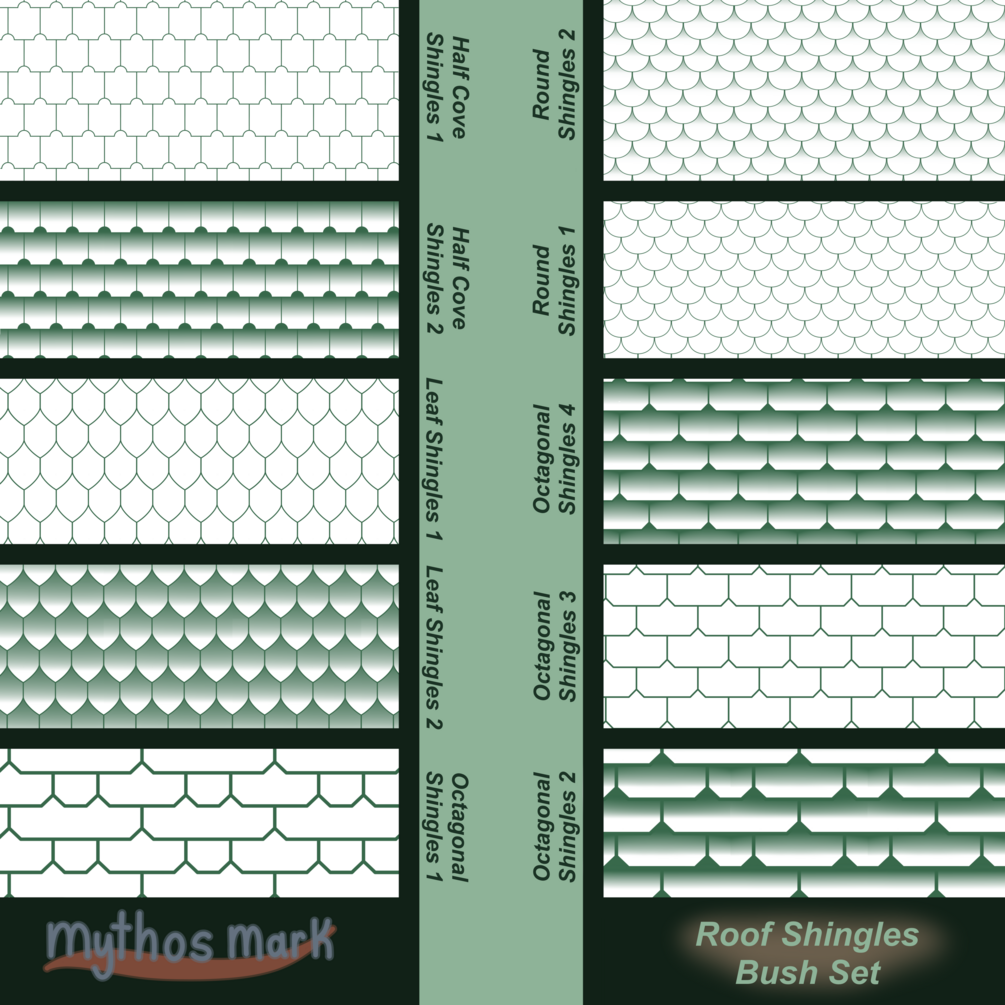 Roofing made easy! This brush set includes 10 roof shingle patterns. You can also use them for walls, scales, and so much more!